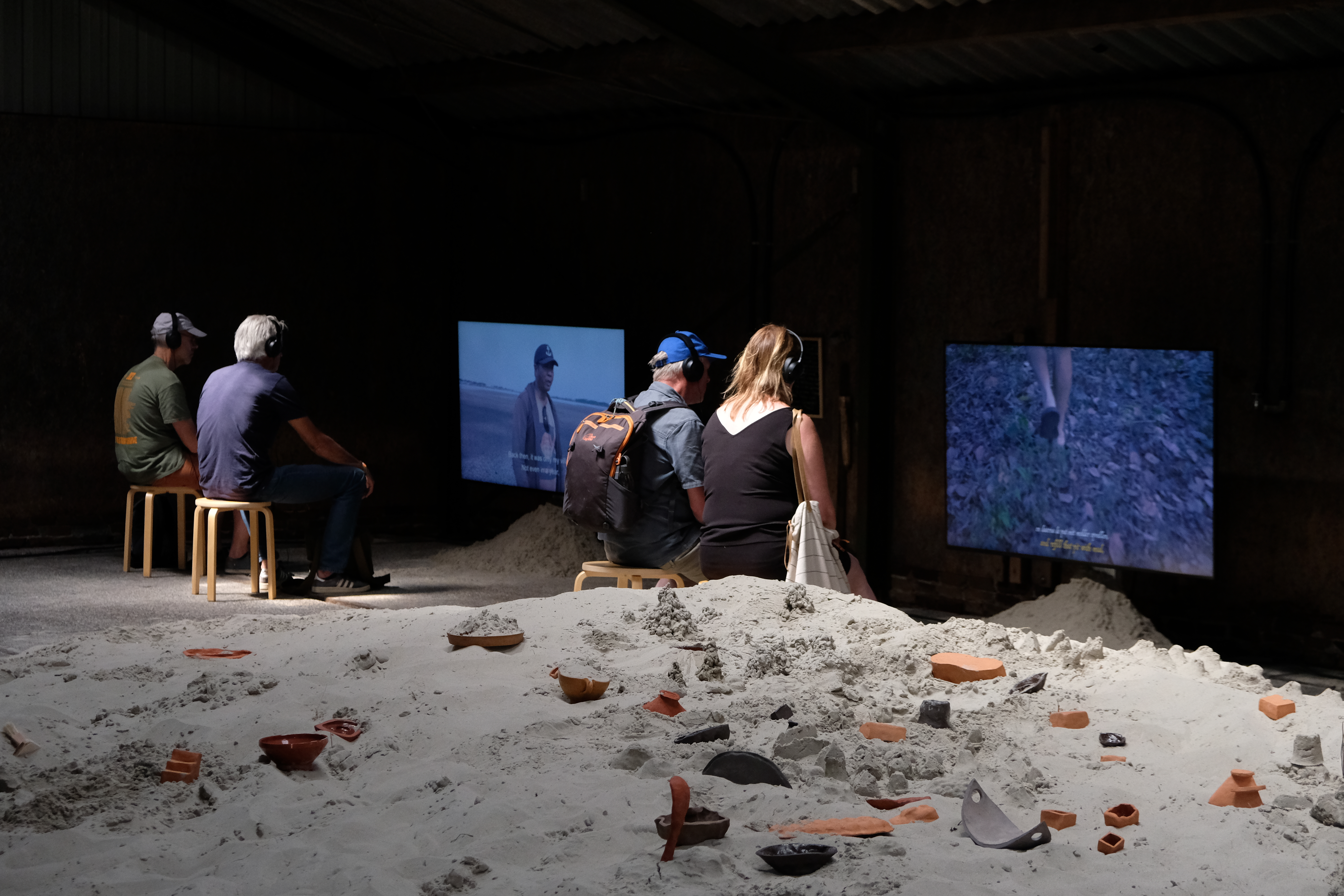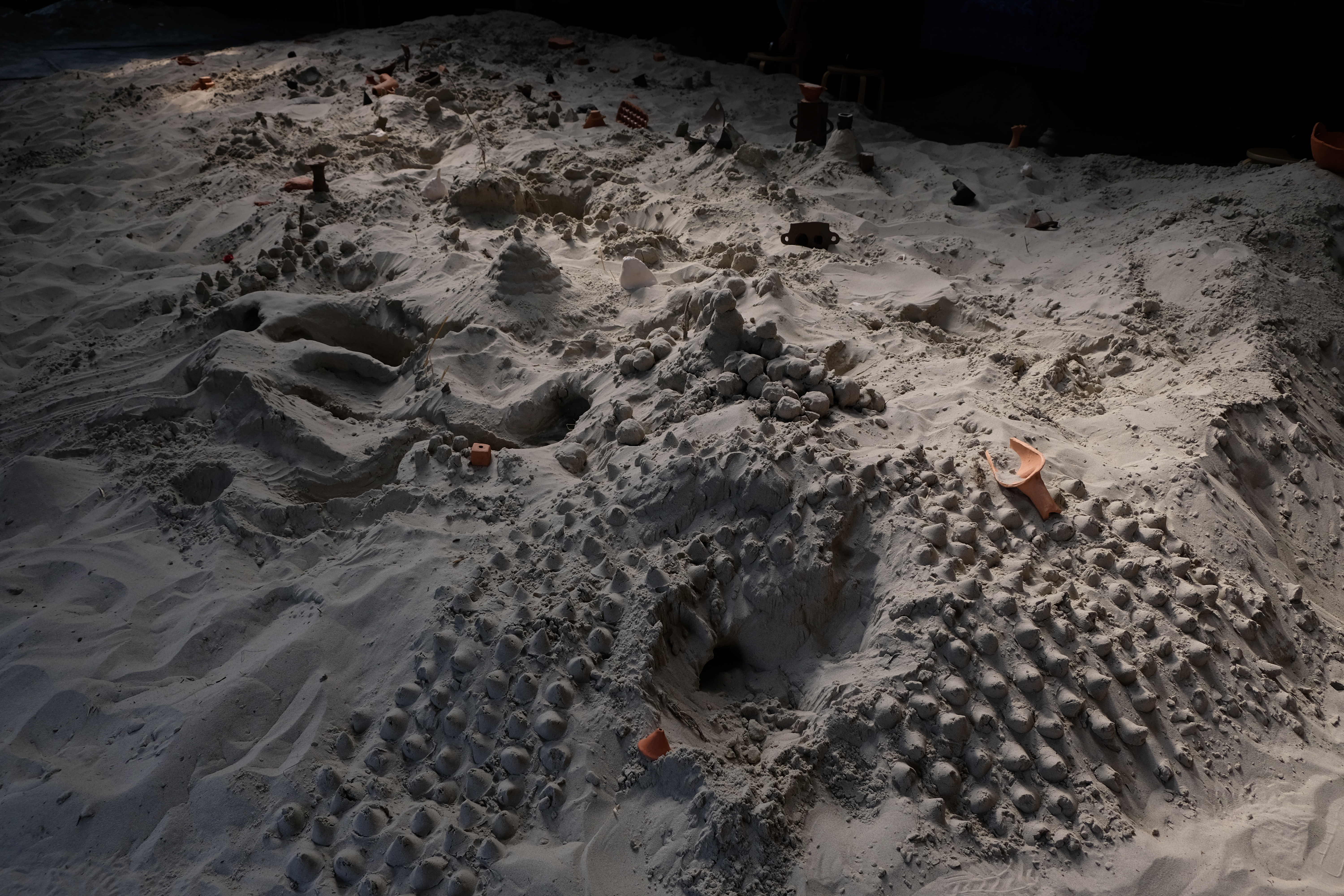sand installation, ceramics, film, animationAn exhibition about mining that presents different perspectives on extraction with the use of films, chalk illustrations and sand installations. The cases of extraction presented show how the ground is active, kicking back, spurting mud with violence. The mud quakes. Who will negotiate with it in court?